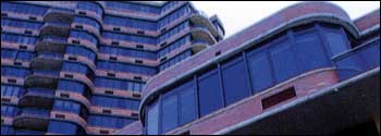 The wide open space of the lobby is greatly enhanced by an inpouring of light from the vaulted skylights above, while richly hued marble floors and brass trim bespeak an ambiance of tasteful opulence. Two curved glass elevators add contemporary style to this most entrancing environment.